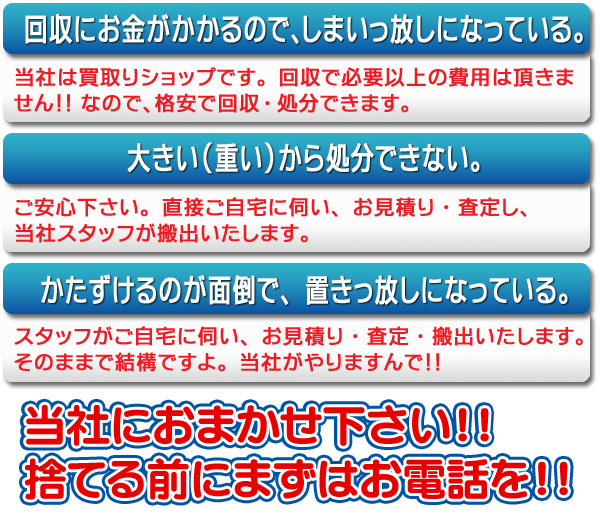 やむを得ず買取りできないお品でも、無料または格安で回収・処分致します。